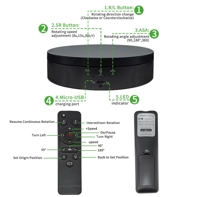 3 speeds (10/15/30 seconds) and 3 rotation angles (45/90/180 degrees) can be adjusted by remote control.