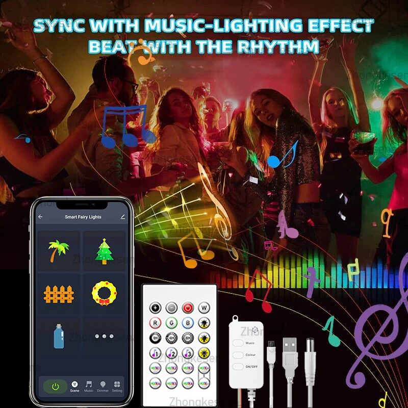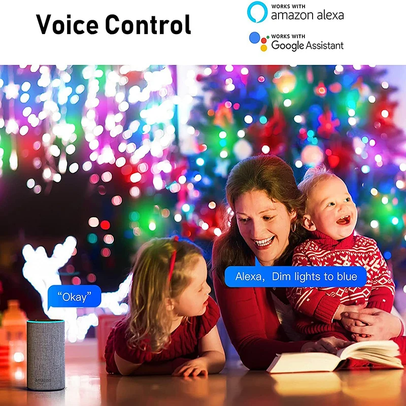 Manage the light string through the control box, infrared remote control, and use the "smart life" application to turn on/off, change the color and music mode, dim the light, set the timer, cycle mode, control from anywhere, Use with Alexa/Google Assistant via voice control.